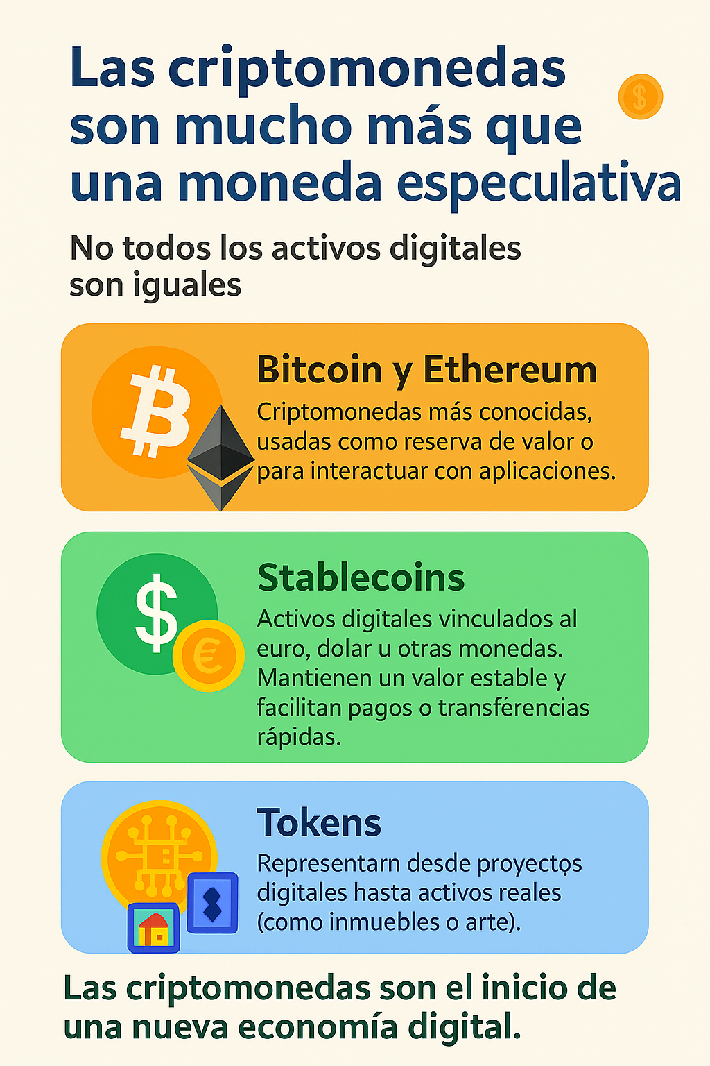 - Stablecoins→ Activos digitales vinculados al euro, dólar u otras monedas. Su objetivo es mantener un valor estable y facilitar pagos o transferencias rápidas.